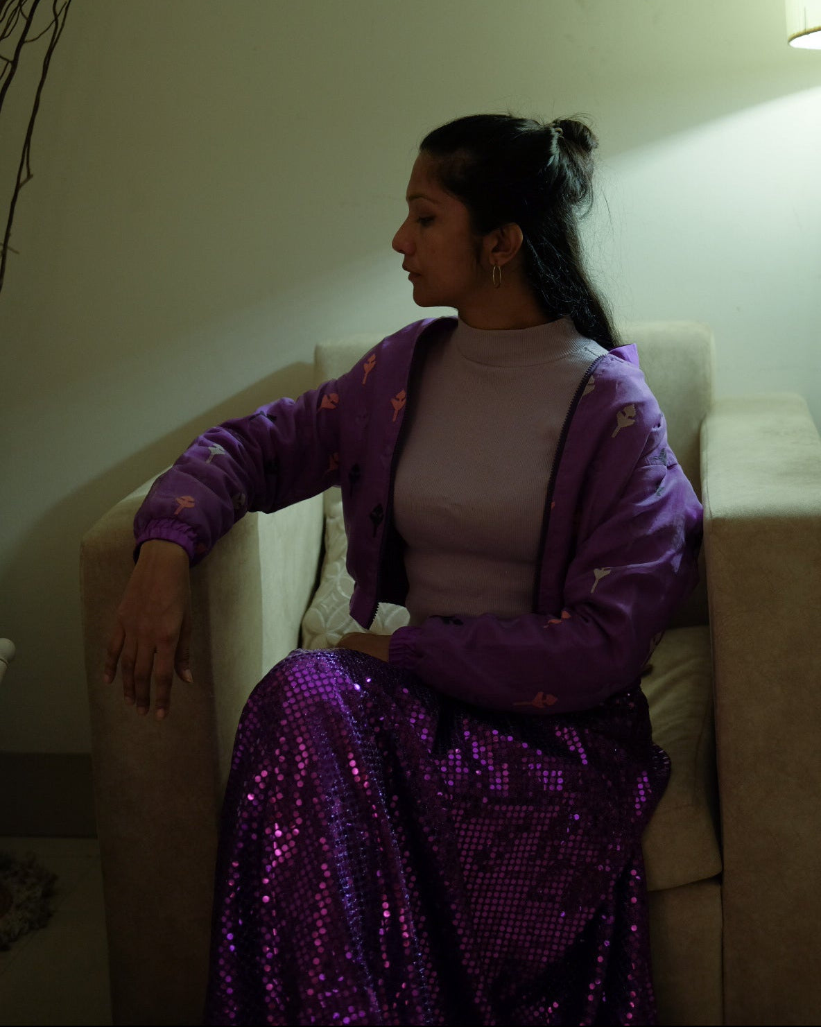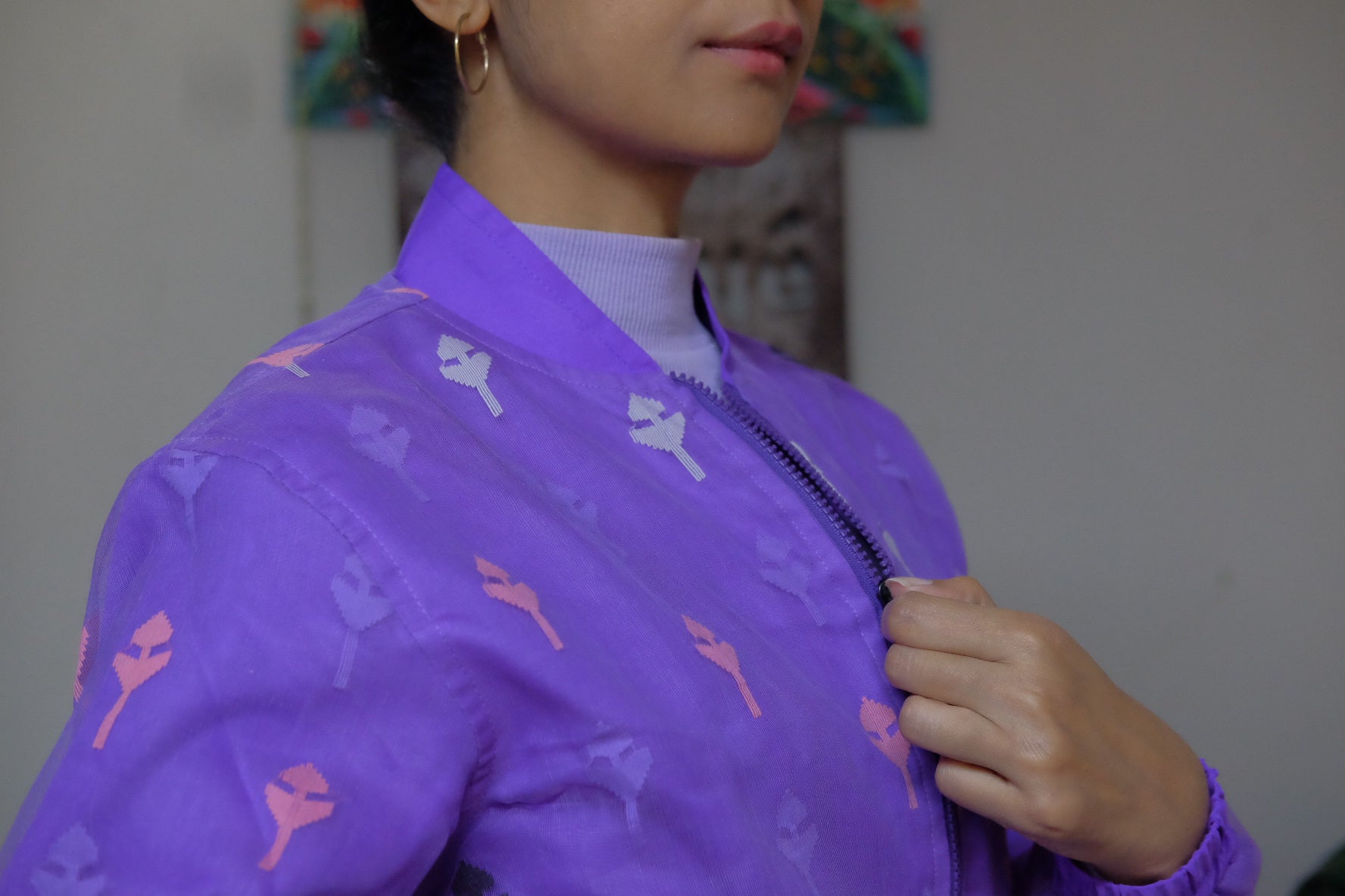 This jacket is crafted using the traditional Jamdani weaving technique on a vibrant purple fabric blend of fine cotton and half silk. The jacket features distinct patterns: the entire body displays all-over, repeating motifs of 'Naak Phul' and 'Koli Phul' woven in multiple contrasting colors including light purple, olive green, and burnt orange. The back yoke features a horizontal band of small geometric motifs woven in similar colors.
