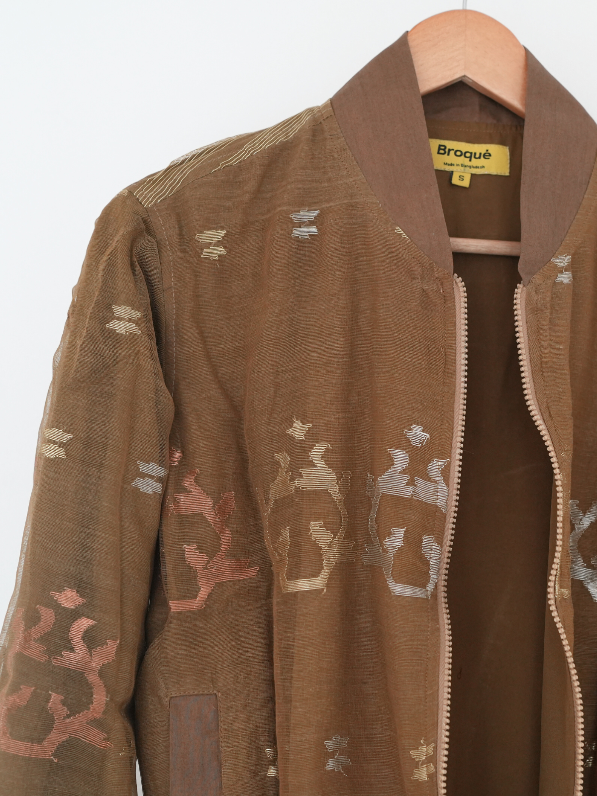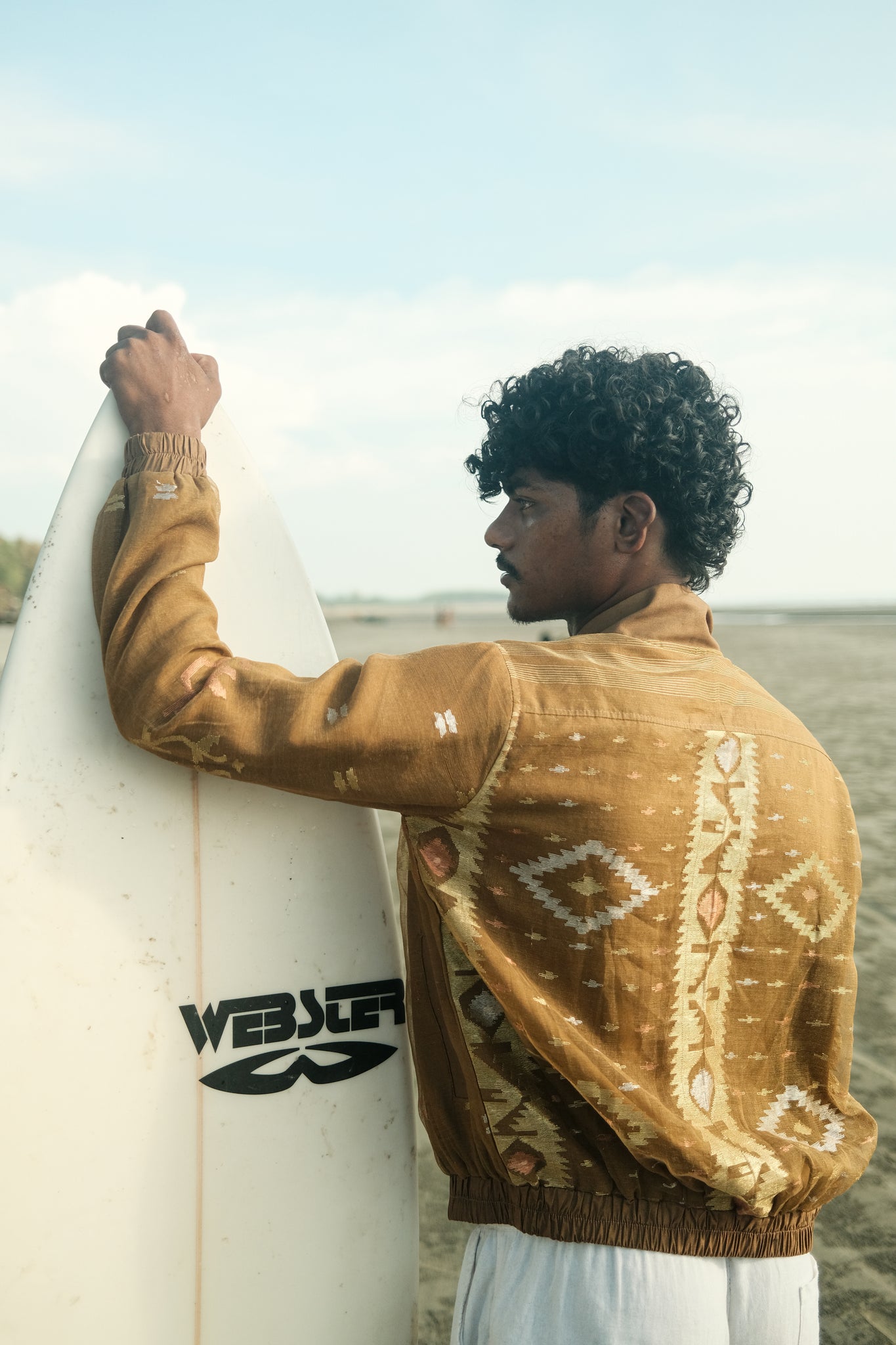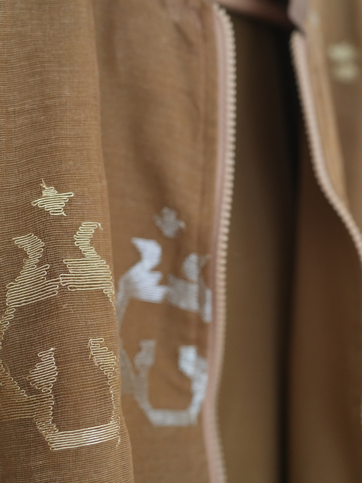 This jacket is crafted using the traditional Jamdani weaving technique on a mustard/brown fabric blend of fine cotton and half silk. The jacket features distinct patterns woven with golden, silver, and muted colored zari: the front displays large central motifs that resemble abstract boughs or crowns, while the back showcases a prominent central pillar motif surrounded by large geometric patterns, including the Guddi (Kite) motif.