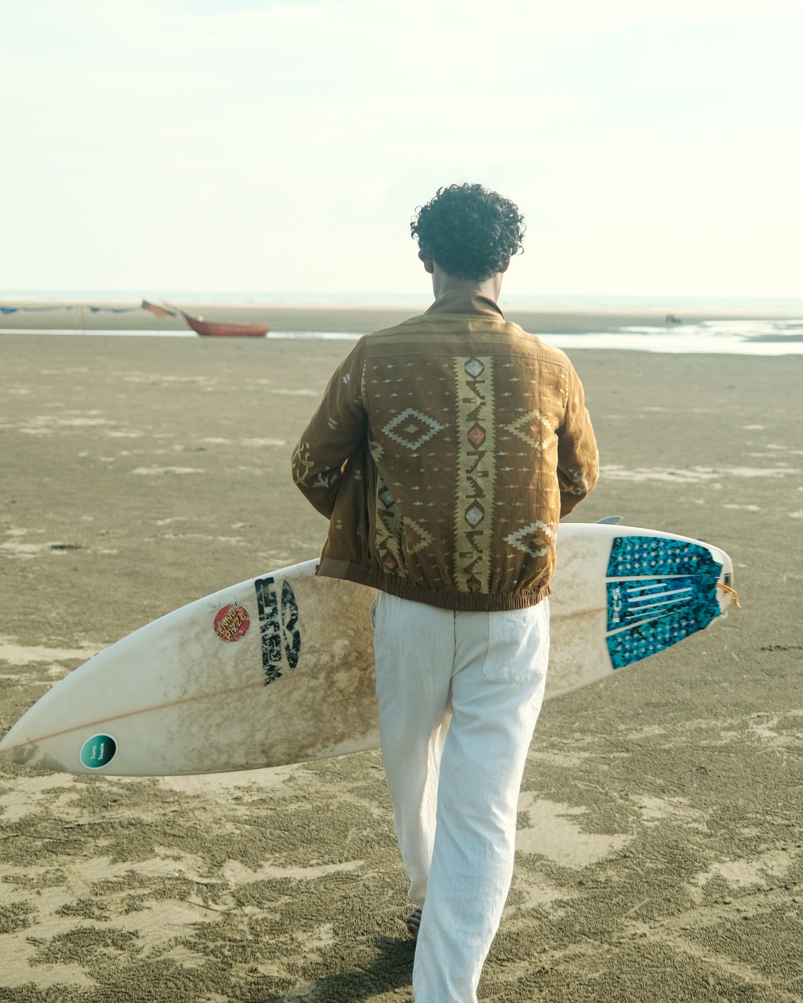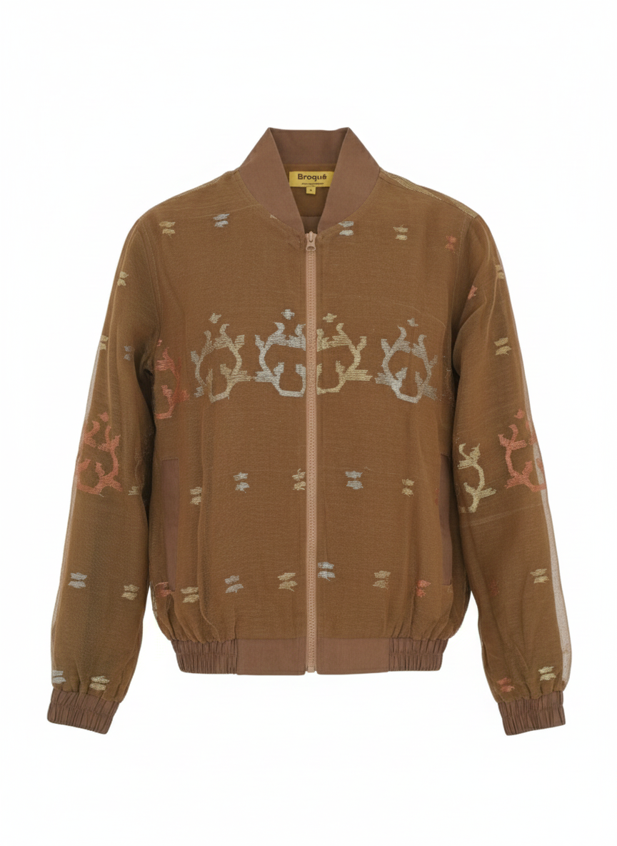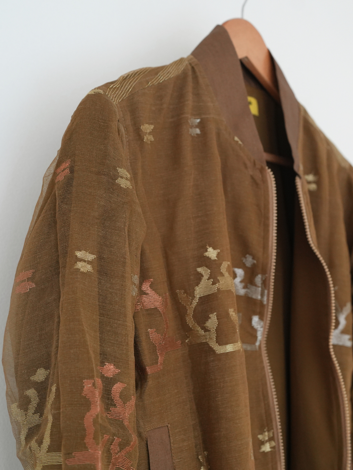 This jacket is crafted using the traditional Jamdani weaving technique on a mustard/brown fabric blend of fine cotton and half silk. The jacket features distinct patterns woven with golden, silver, and muted colored zari: the front displays large central motifs that resemble abstract boughs or crowns, while the back showcases a prominent central pillar motif surrounded by large geometric patterns, including the Guddi (Kite) motif.