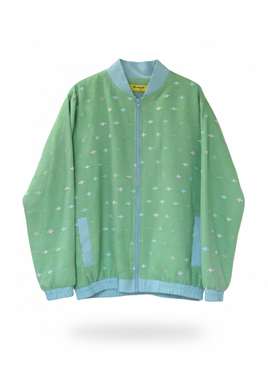 This jacket is crafted using the traditional Jamdani weaving technique on a paste green fabric blend of fine cotton and half silk. The jacket features distinct patterns: the front displays all-over repeating motifs of paan tesri and phool achol(the cross-like florals) woven in soft pastel shades, while the back showcases vertical stripes composed of alternating pastel pink and blue arrow, leaf, or chevron motifs, with horizontal striped bands across the shoulder area.